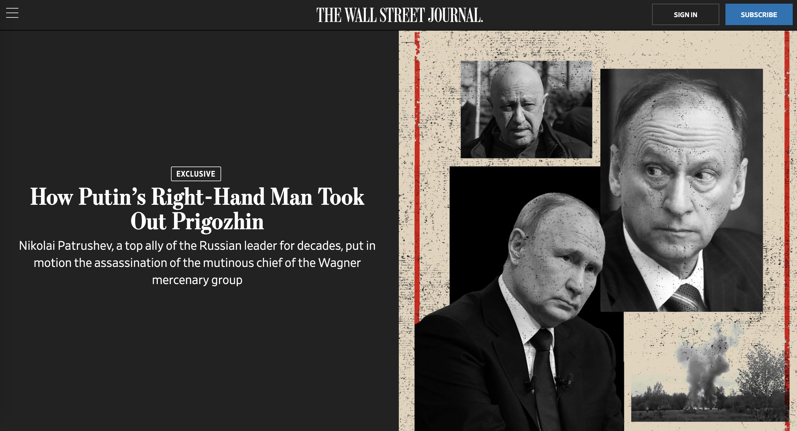 Убийство Пригожина готовилось два месяца и было одобрено лично Патрушевым, пишет WSJ со ссылкой на источники в западных спецслужбах. Патрушев давно предупреждал Путина, что ставка на "Вагнера" в Украине дает Пригожину слишком большое политическое и военное влияние, которое угрожает Кремлю.