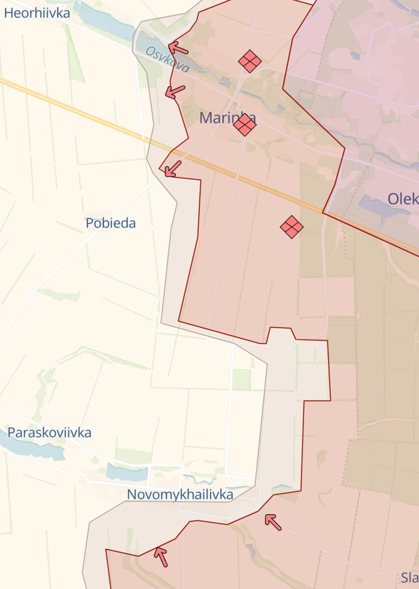 К югу от Марьинки россияне заявляют о захвате укрепрайона "Зверинец" - между Новомихайловкой и Победой. Украина этого не подтверждала. Но если данная информация подтвердится, то противник сможет подойти к Новомихайловке с севера (сейчас село штурмуют с юга).
