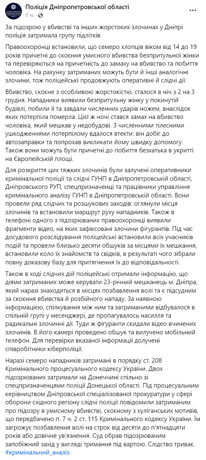 В Днепре подростки убивали бездомных и снимали это на видео. Правоохранители установили, что семеро ребят в возрасте от 14 до 19 лет причастны к совершению умышленного убийства беспризорной женщины и проверяются на причастность к покушению на убийство и избиение мужчины.