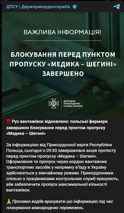 "По информации от Пограничной стражи Республики Польша, сегодня в 09:30 завершилась акция протеста перед пунктом пропуска "Медика - Шегини".