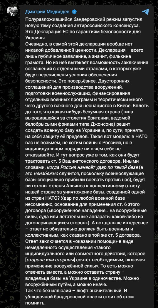 "И тут вопрос уже в том, как они будут трактовать ст. 5 Вашингтонского договора. Иными словами, когда Россия нанесёт удар по такой базе (а это неизбежно случится, поскольку военнослужащие базы специально прибыли воевать против нас), будут ли готовы страны Альянса к коллективному ответу нашей стране за уничтожение базы, созданной одной из стран НАТО?", - пишет Медведев.