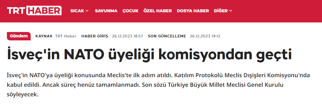 Во вторник, 26 декабря комиссия по международным делам парламента Турции утвердила ратификационный протокол о вступлении Швеции в состав НАТО.
