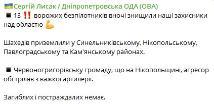 07.37 Ночью над Днепропетровской областью были сбиты 13 вражеских беспилотников.