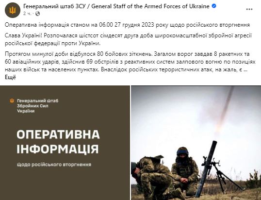 Война в Украине идет уже 672-й день. Мы следим за последними новостями и ключевыми событиями 27 декабря 2023 года в обновляемом онлайне.