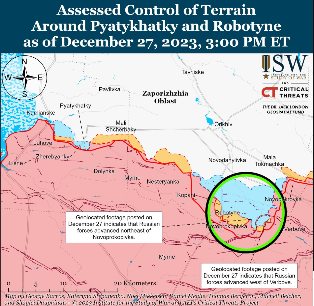 Институт связывает это с тем, что "украинские войска отошли зимой на более защищенные позиции возле Работино". Аналитики ссылаются на кадры с геолокацией, опубликованные 14 и 27 декабря. Они показывают, что российские войска продвинулись к западу от Вербового.