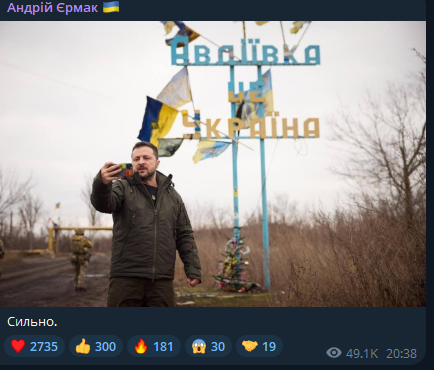 Глава Офиса президента Андрей Ермак опубликовал селфи президента Украины Владимира Зеленского на фоне въезда в Авдеевку.