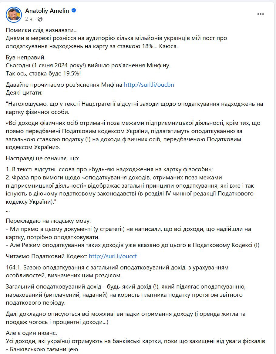 "Которая, согласно плану Национальной стратегии доходов, будет снята, начиная с 2025 года", - пишет Амелин на своей странице в Фейсбуке.