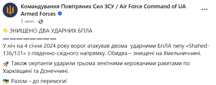 Ночью 4 января россияне запустили по Украине три зенитных управляемых ракеты и два беспилотника.