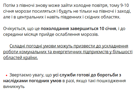 Похолодание, которое ожидается в Украине с 6 по 10 января, может "привести к усложнению" работы энергетических предприятий в большинстве областей страны.