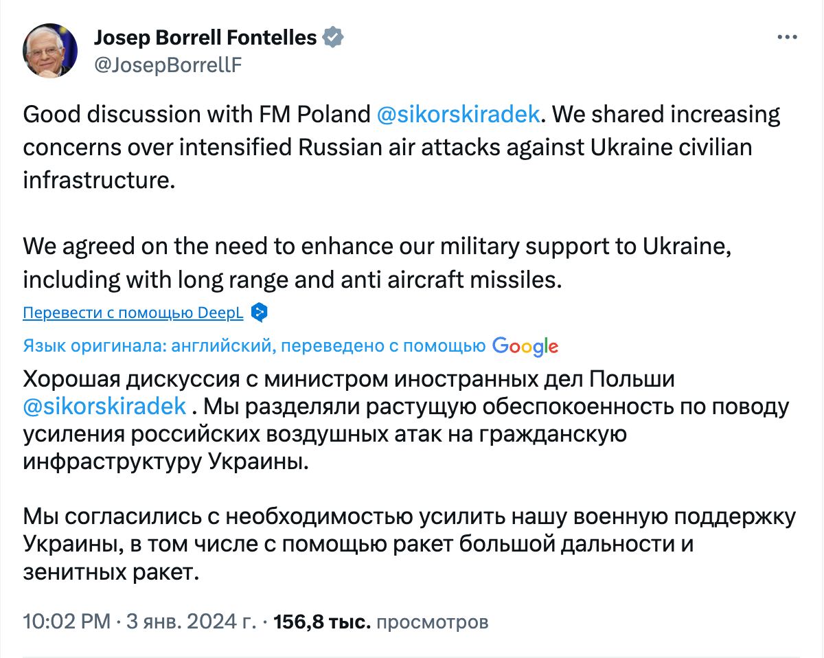 Об этом Боррель сообщил в Х после разговора с Радославом Сикорским.