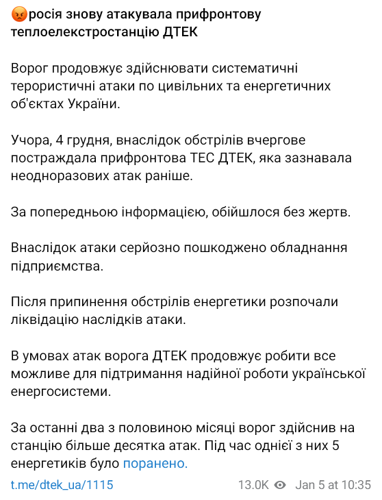 РФ в очередной раз атаковала прифронтовую теплоэлектростанцию (ТЭС), которая уже более 10 раз подвергалась обстрелам.