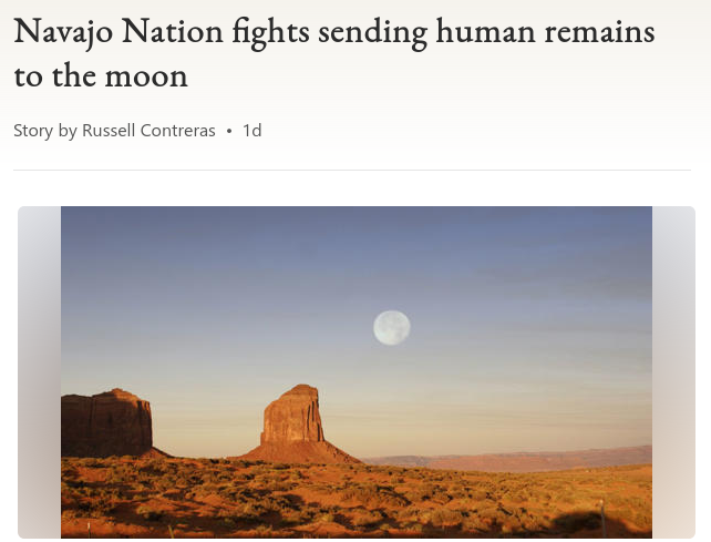 "Идея отправки человеческих останков на Луну вызывает глубокое беспокойство у народа Навахо, поскольку это может превратить её восприятие нами из священного места в кладбище, что не только само по себе вызывает дискомфорт, но и противоречит нашим культурным традициям", - говорится в заявлении представительства племени.