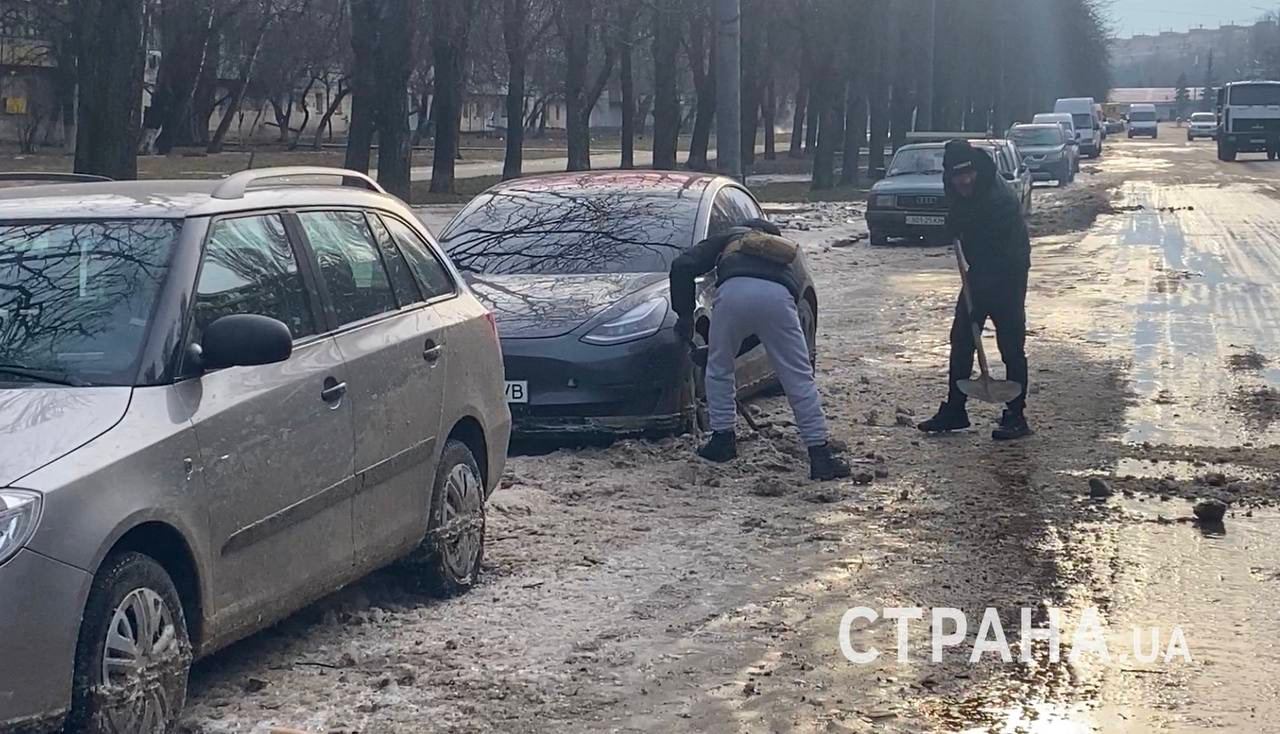 На Борщаговке в Киеве, где в ночь на 8 января произошел прорыв на улице Жюля Верна, коммунальщики с утра чистят лед, который намерз на дороге.