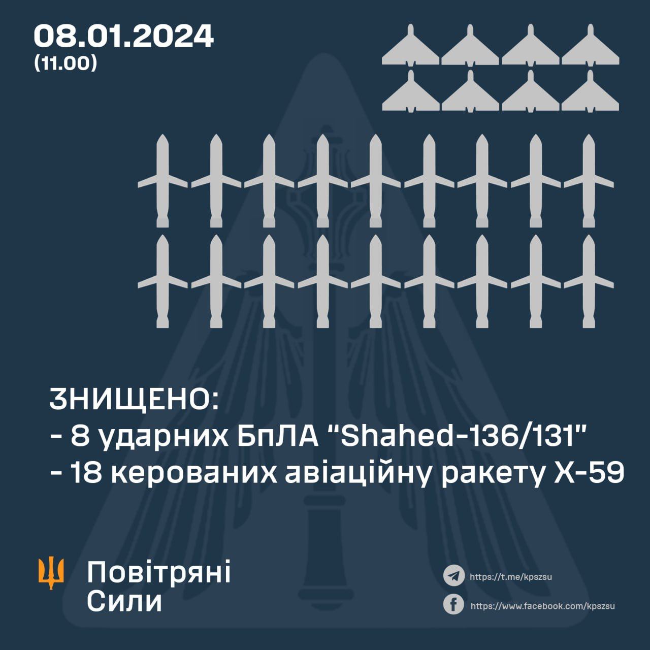 В ночь на 8 января 2024 года противник нанес массированный удар по Украине, применив крылатые, авиационные, баллистические, зенитные управляемые ракеты и ударные БПЛА.