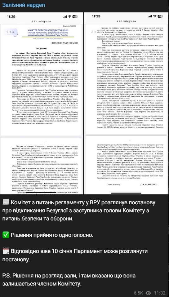 Сегодня, 8 января, комитет по вопросам регламента Верховной Рады единогласно одобрил отзыв Марьяны Безуглой с должности замглавы комитета по вопросам нацбезопасности и обороны.