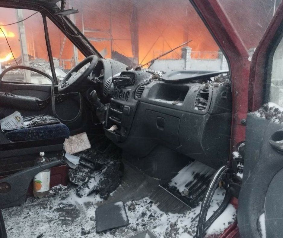 В Новомосковске пострадала маршрутка с людьми. Она перевернулась от ударной волны. Всем пассажирам и водителю удалось выбраться. На фото на фоне маршрутки горит какой-то объект.