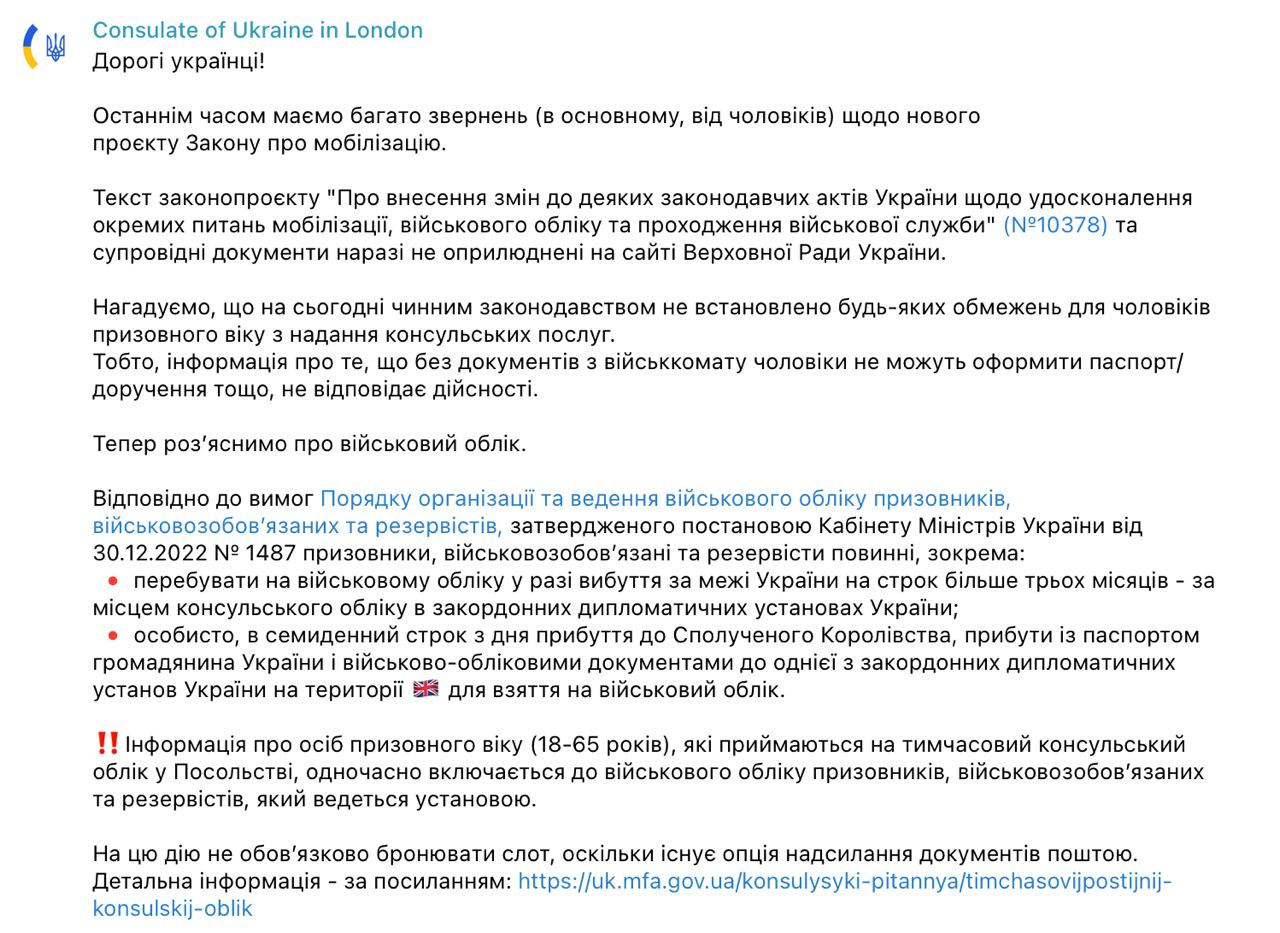 13.15 Консульство Украины в Лондоне призвало украинцев за границей встать на военный учет.