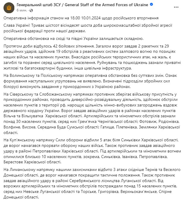В среду, 10 января, в Украине идет 686-й день войны.