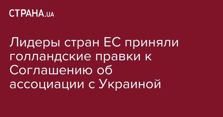 Лидеры Евросоюза согласовали предложенные Нидерландами правки об условиях завершения ратификации в стране Соглашения об ассоциации Украина - ЕС. Это решение вступит в силу только после завершения ратификации нидерландской стороной.