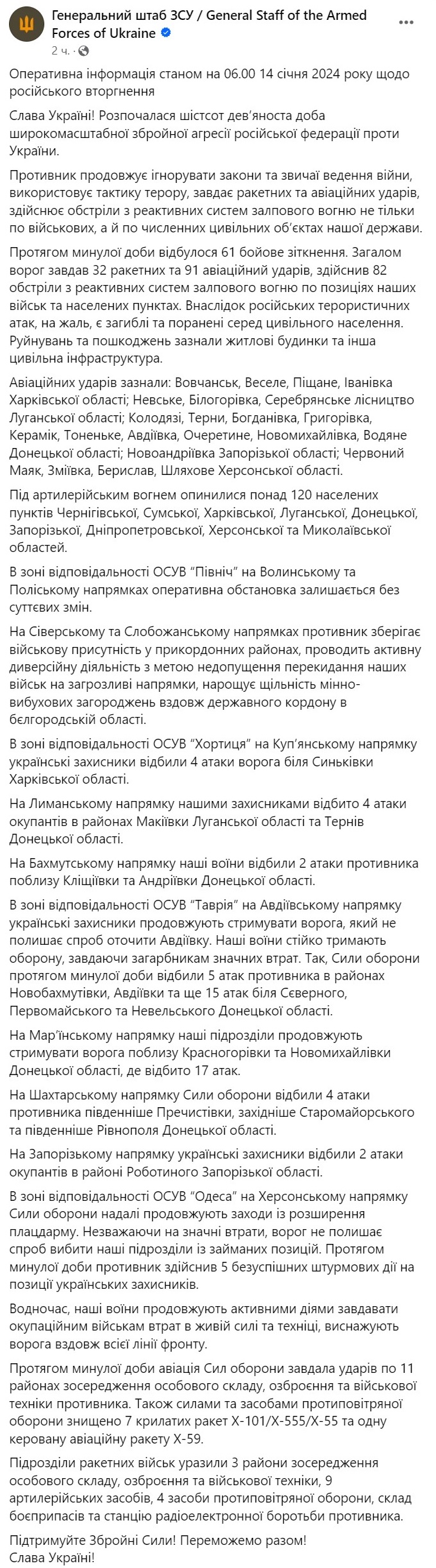 Война в Украине идет уже 690-й день. Мы следим за последними новостями и ключевыми событиями 14 января 2024 года в обновляемом онлайне.