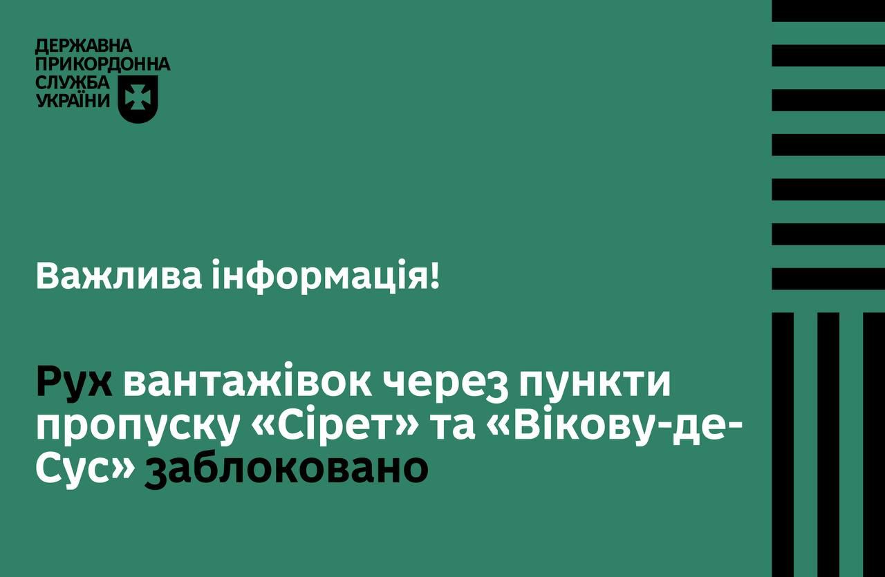 Также от пограничной полиции Румынии получена информация о начале блокировки движения грузовых автомобилей на направлении румынского пункта пропуска "Виковую-де-Сус" напротив украинского – "Красноильск".