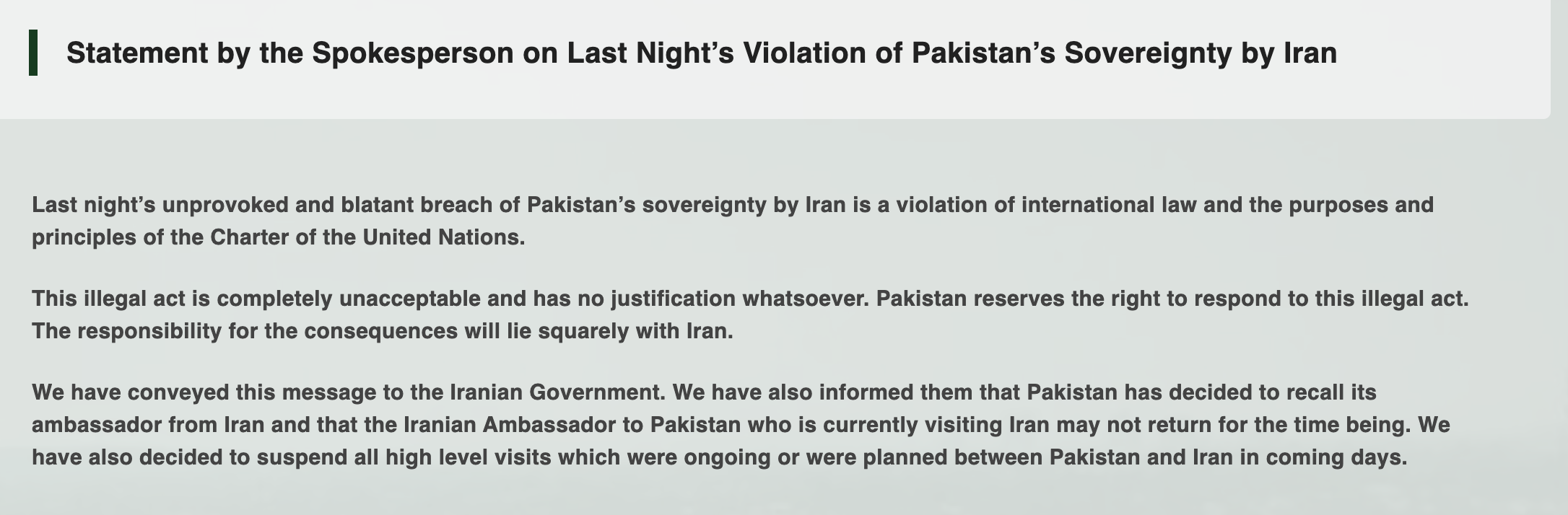 Пока же Исламабад отзывает своего посла и приостановливает визиты на высоком уровне. А иранский посол, который сейчас находится на родине, "возможно, пока не вернется".