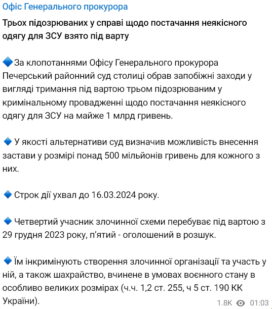 Имена подозреваемых не называются. Накануне отмечалось, что это - два руководителя предприятий и их представитель. Они проходят по делу поставок некачественной одежды для ВСУ.