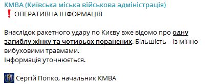 Утром 23 января в результате ракетного удара по Киеву уже известно об одной погибшей женщине и четырех раненых.