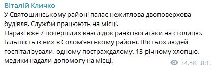 По данным мэра Виталия Кличко, всего в городе семь пострадавших. Большинство - в Соломенском районе.