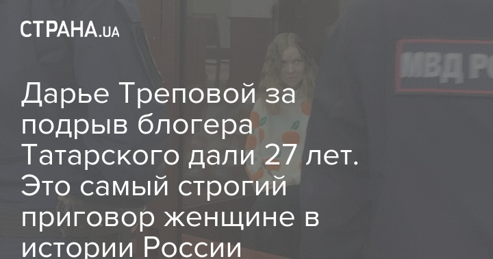 В российском Санкт-Петербурге Второй Западный окружной военный суд приговорил Дарью Трепову к 27 годам колонии строгого режима. Приговор вынесен по делу о теракте, в результате которого погиб военкор Владлен Татарский (настоящее имя — Максим Фомин), а еще 52 человека пострадали.