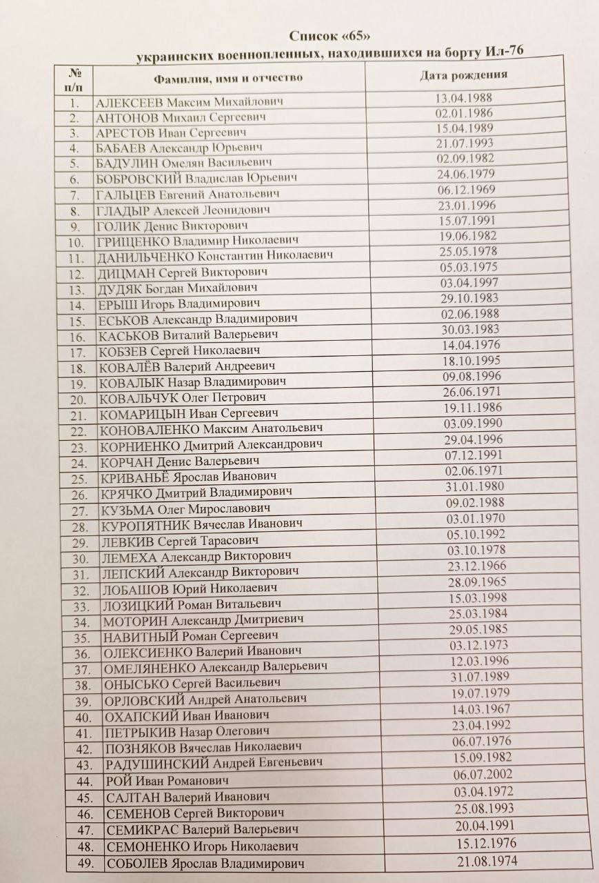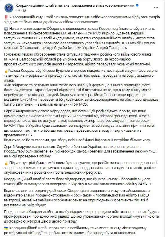 Украинский Координационный штаб по вопросам обращения с военнопленными подтвердил, что 65 украинских защитников из списка, ранее опубликованного россиянами, действительно планировалось вернуть в Украину в рамках планируемого обмена 24 января.