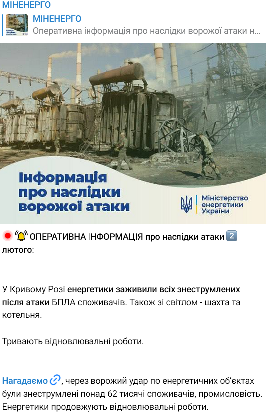 В Кривом Роге полностью восстановили свет у всех потребителей после прилета в подстанцию. Шахта и котельная также запитаны.