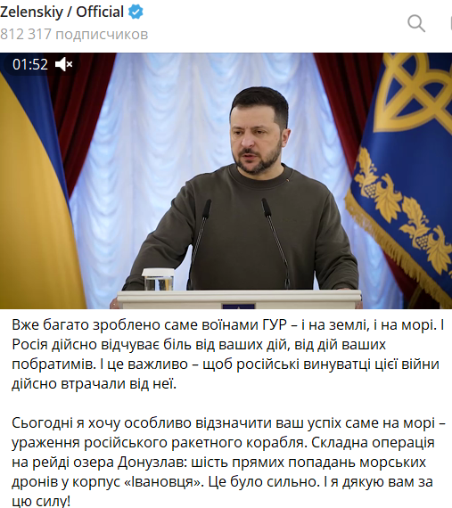 "Сложная операция на рейде озера Донузлав - шесть прямых попаданий морских дронов в корпус "Ивановца". Это было действительно сильно. И я благодарю вас за эту силу", - сказал президент разведчикам.