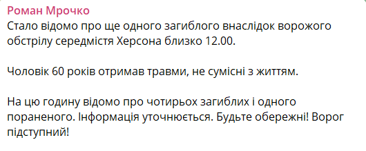"Стало известно ещё об одном погибшем в результате вражеского обстрела центра Херсона около 12.00. Мужчина 60-ти лет получил травмы, не совместимые с жизнью. К настоящему времени известно о четырёх погибших и одном раненом. Информация уточняется", - пишет Мрочко.