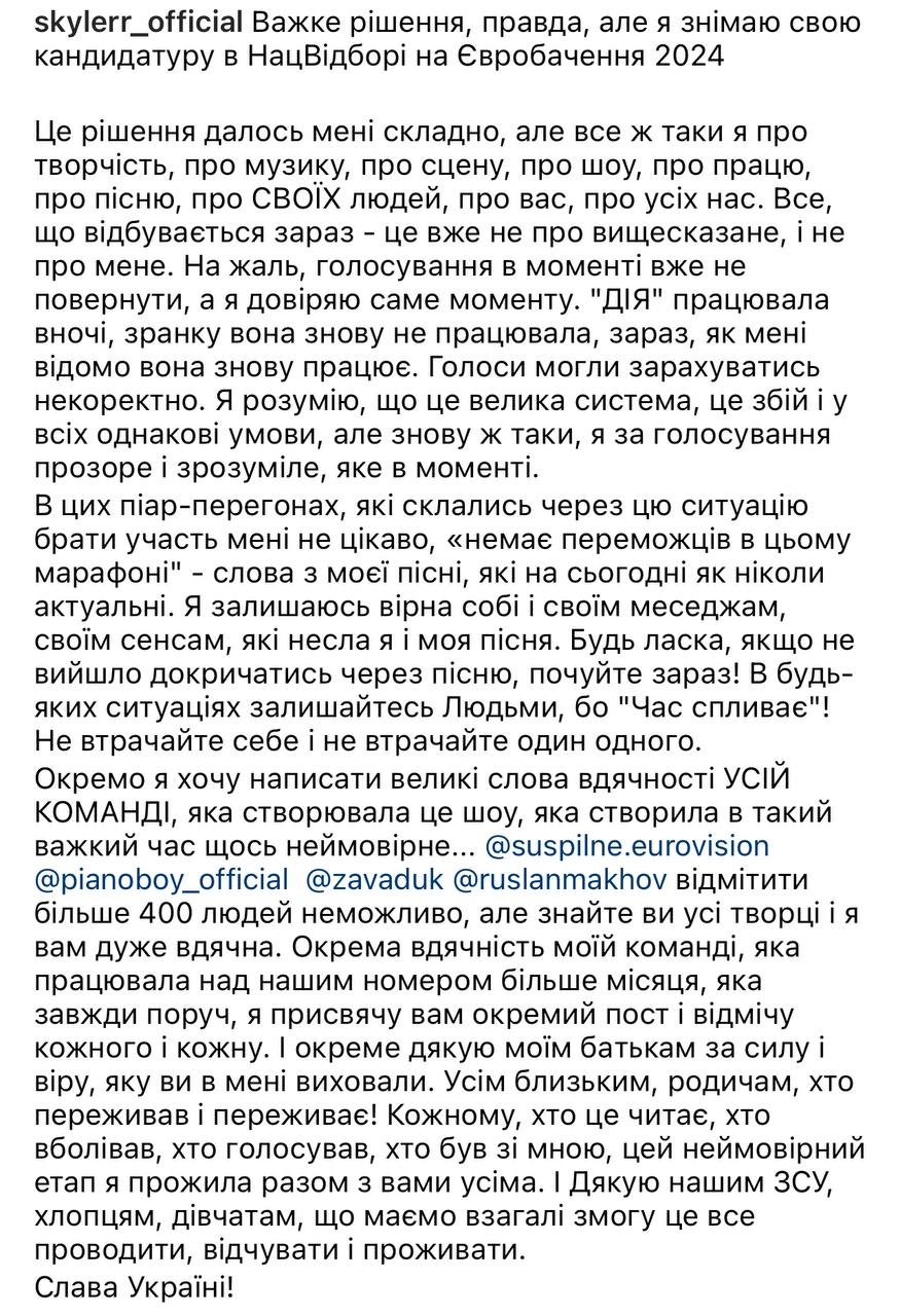 Певица SKYLER сняла свою кандидатуру с Нацотбора на Евровидение. Фото: Instagram