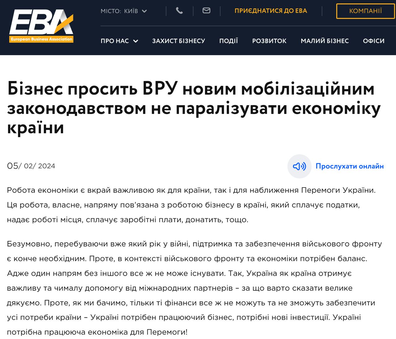"Бизнес убежден, что ключевой задачей должно быть создание действительно работающих норм, сбалансированных, которые можно выполнить и которые не парализуют работу части страны. Собственно, поэтому, по убеждению Европейской Бизнес Ассоциации, вышеупомянутый законопроект и нельзя принимать, а нужно еще раз сознательно подойти к его доработке – чтобы не остановить работу страны и, в частности, ее экономики", - говорится в заявлении.