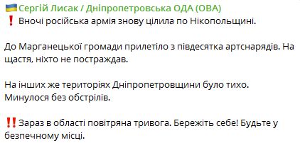 07.35 Ночью армия РФ ударила из артиллерии по Днепропетровской области - Никопольскому району. Полтора десятка снарядов выпустили по Марганецкой громаде. О пострадавших не сообщается.