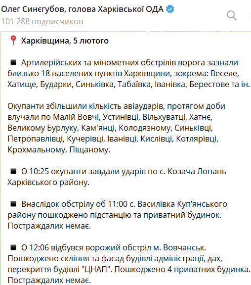 Об этом сообщил 5 февраля глава Харьковской областной военной администрации Олег Синегубов в своем телеграм-канале.
