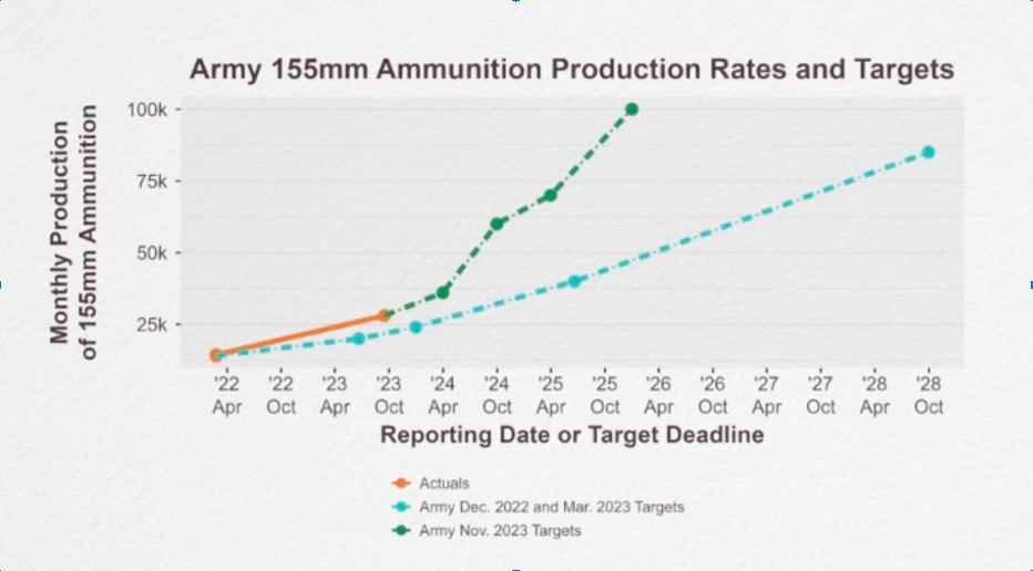 Как передает Defense One, ежемесячное производство 155-мм артиллерийских снарядов в США планируется увеличить с 28 000 в октябре прошлого года, до 37 000 в апреле 2024 и 60 000 в октябре, 75 000 в апреле 2025 и 100 000 в октябре. А до вторжения РФ было 14 000.
