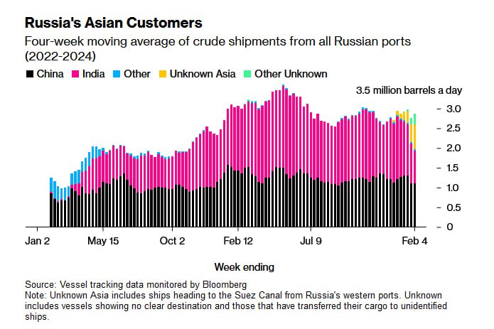За неделю с 29 января по 4 февраля погрузку в порту Козьмино, который обеспечивает поставки нефти в страны Азиатско-Тихоокеанского региона, завершили 11 танкеров. Объемы поставок из Усть-Луга и Приморска тоже выросли.
