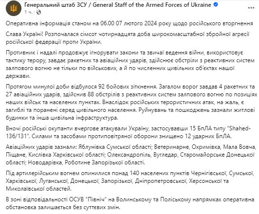 Утром 7 февраля Генштаб ВСУ обнародовал сводку о ситуации на фонте за минувши сутки.