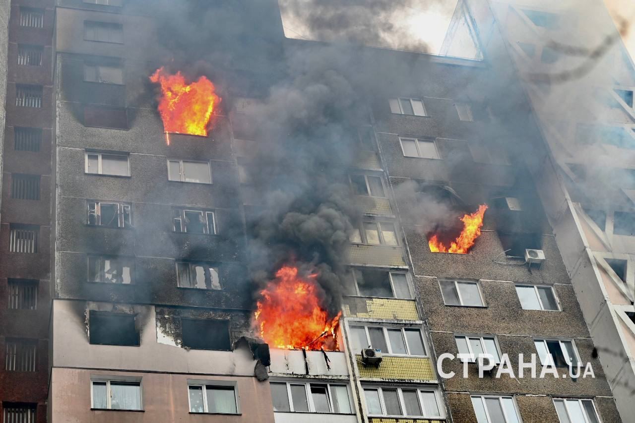 Кадры многоэтажного дома в Голосеевском районе Киева со стороны прилета. Было разрушено несколько балконных перекрытий. Повреждено минимум семь этажей.