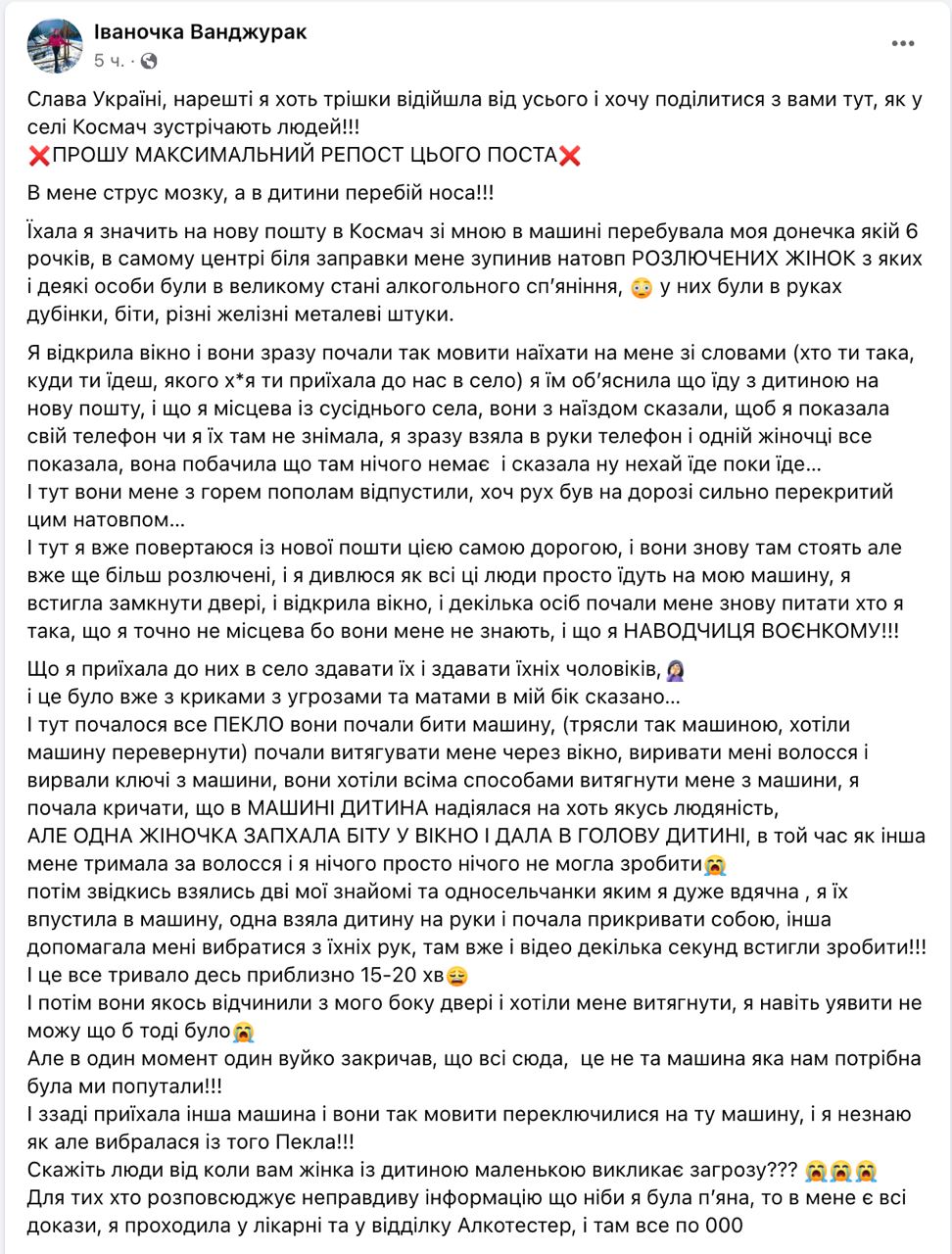 "Одна женщина засунула биту в окно и дала по голове ребенку, в то время как другая меня держала за волосы и я ничего просто ничего не могла сделать. В один момент один дядя закричал, что все сюда, это не та машина которая нам нужна была мы попутали. И сзади приехала другая машина и они так сказать переключились на ту машину, и я не знаю, как но выбралась из этого Ада", - пишет женщина в соцсетях.