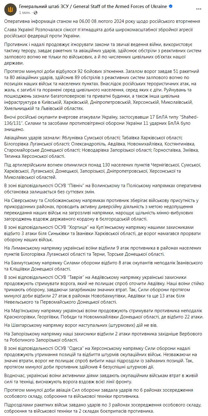 В четверг, 8 февраля, в Украине идет 715-й день войны с Россией.