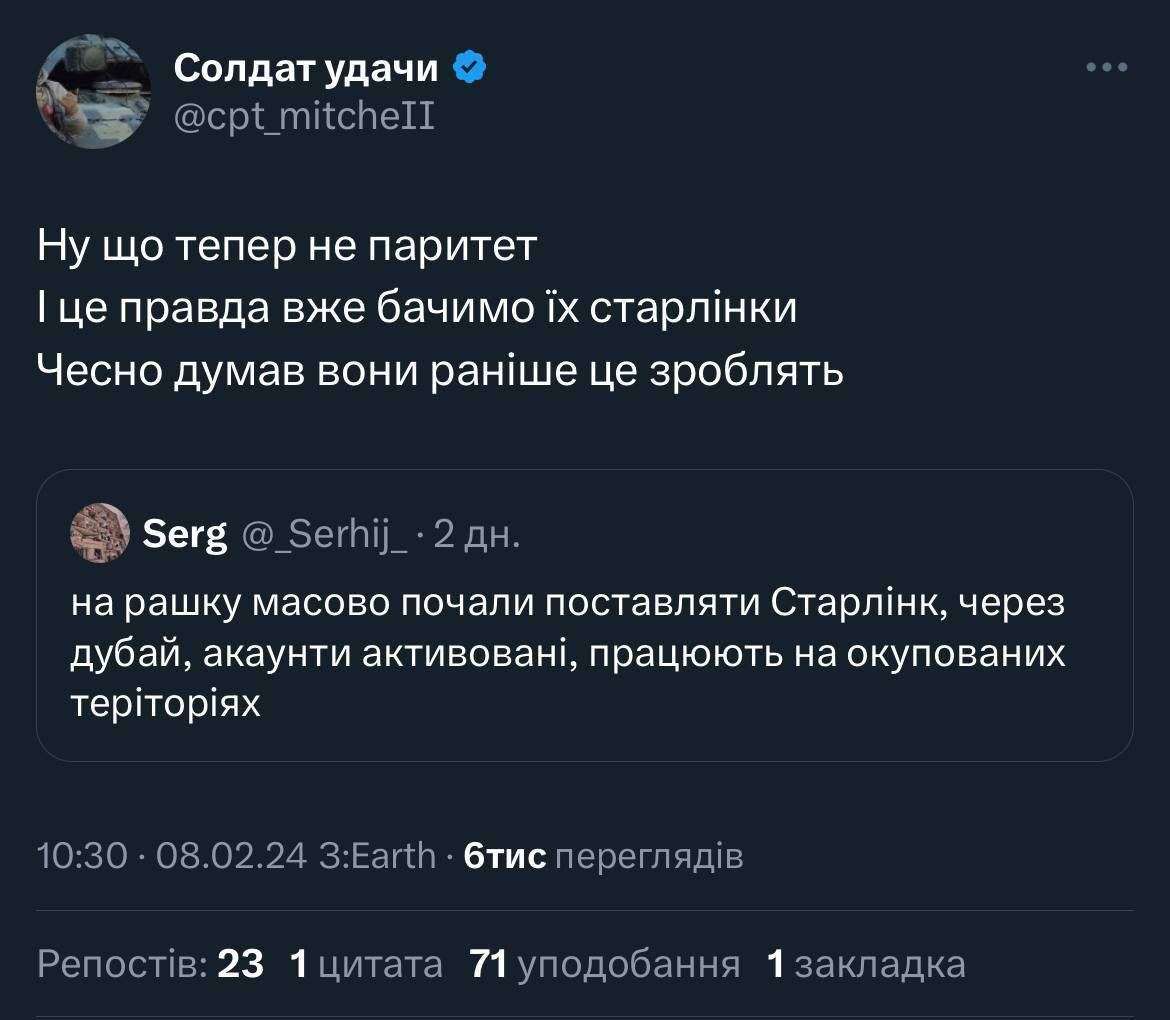 В то же время украинские военные жалуются, что их интернет от Starlink стал очень медленный - буквально 0,3 мб\с. По их словам, проблемы наблюдаются уже несколько месяцев, а в последнюю неделю особенно сильно.