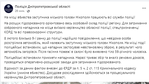 "По данным следствия, 8 февраля на одной из улиц Никополя неизвестные из неустановленного огнестрельного оружия расстреляли автомобиль, в котором находился заместитель городского главы", - сказано в публикации ведомства.