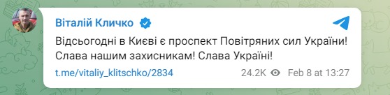 "За такое название выступают киевляне, выступает руководство Генштаба и ГУР, наши военные. Есть обращение от них. И этот вопрос мы уже обсуждаем давно. Поэтому считаю, что пора уже поставить точку. И предлагаю наконец принять этот вопрос. Воздушные силы ежедневно и каждую ночь защищают небо, сбивают дроны и ракеты, летящие на украинские города и села. И наши защитники заслуживают того, чтобы выразить им уважение и благодарность", - заявил на заседании Кличко.