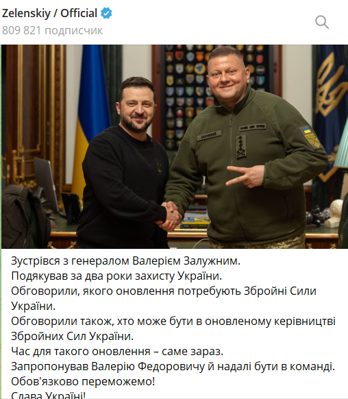 В свою очередь Валерий Залужный также опубликовал сообщение о встрече с президентом, однако также ничего прямо о своей отставке не сказал. В то же время главком ВСУ дал понять, что командование Вооруженных сил меняется.