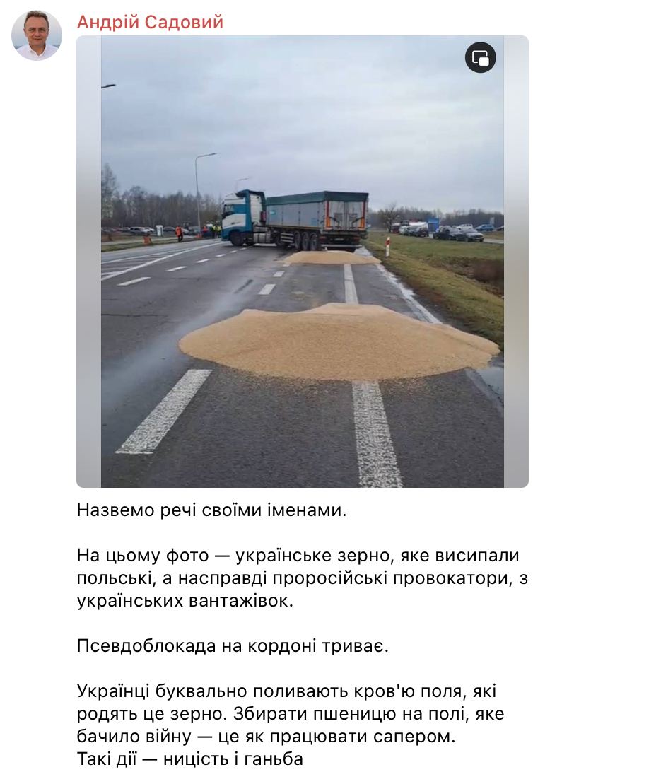 "Назовем вещи своими именами. На этом фото - украинское зерно, которое высыпали польские, а на самом деле пророссийские провокаторы, из украинских грузовиков. Псевдоблокада на границе продолжается. Украинцы буквально поливают кровью поля, которые родят это зерно. Собирать пшеницу на поле, которое видело войну - это как работать сапером. Такие действия - низость и позор", - написал Садовый.