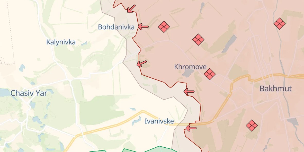 Третья "горячая" точка - подступы к Часову Яру, к западу от Бахмута. Ситуация там для ВСУ продолжает ухудшаться, пишет Deep State. По его данным, российские войска продвигаются между Богдановкой и Ивановским к господствующей высоте - хребту, за которым находится Часов Яр.